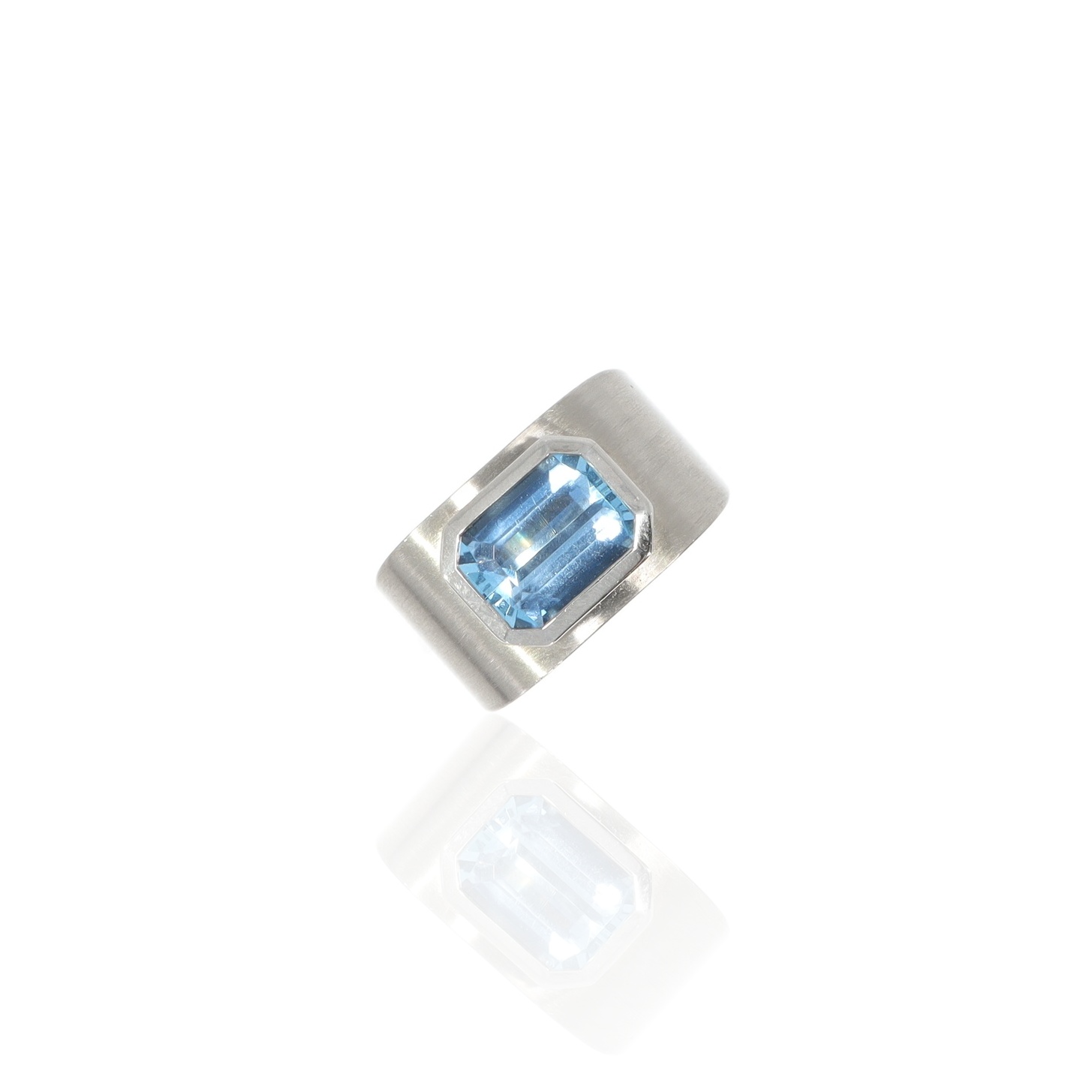 Solid palladium ring with an octagonal faceted aquamarine in a clear setting. The wide ring band and cool blue tone characterize the functional studio style.