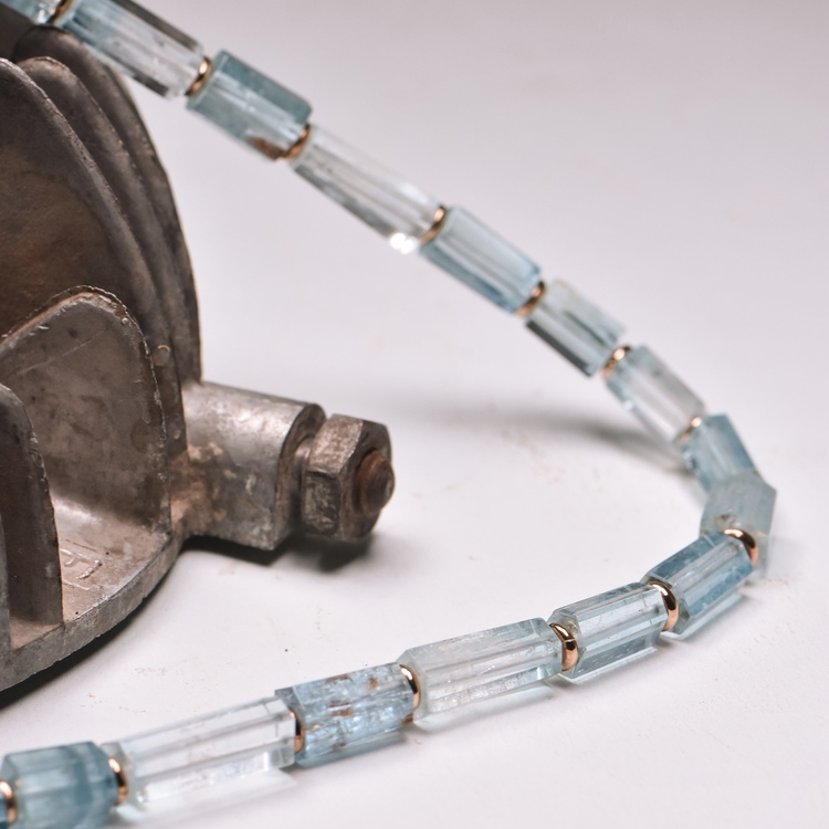 Long sautoir necklace made of aquamarine crystals with a geometric yellow gold clasp and a trillant in the center. The clear lines and cool colors characterize the overall graphic design.
