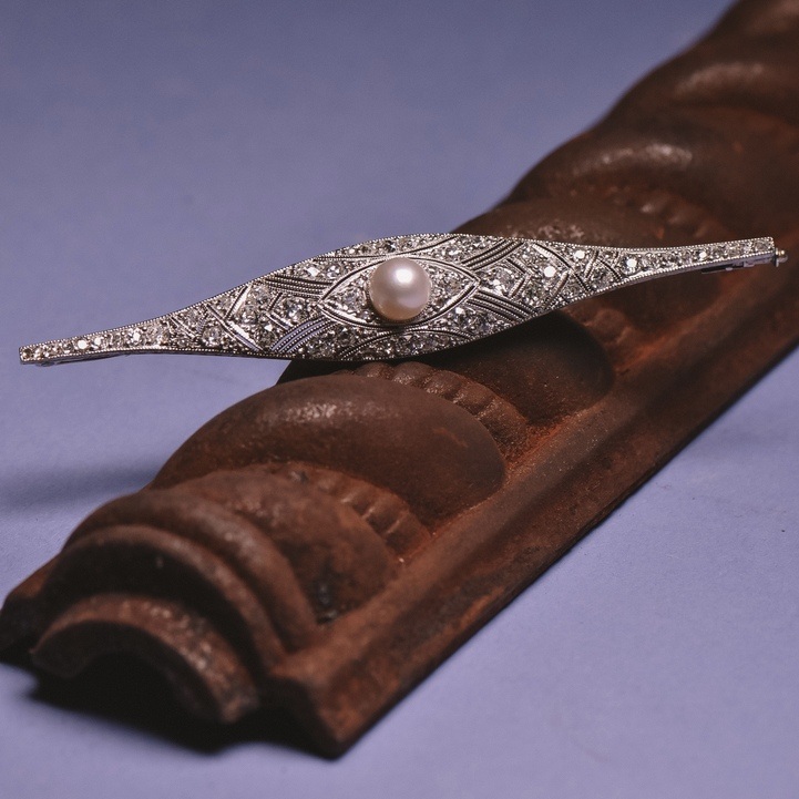 Slim white gold brooch with an Akoya cultured pearl in the center and old and rose-cut diamonds. The linear design and fine craftsmanship characterize the calm overall appearance.