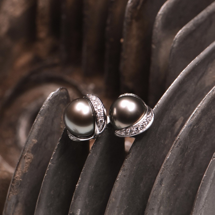 White gold stud earrings with Tahitian cultured pearls and brilliant-cut diamonds in a clear setting. The combination of dark pearl luster and light-colored stones creates a subtle contrast.