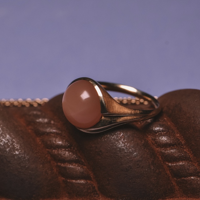 A gently shimmering moonstone cabochon is set in a delicately curved yellow gold setting. The calm design language gives this secondhand piece of jewelry a subtle and clear aura.