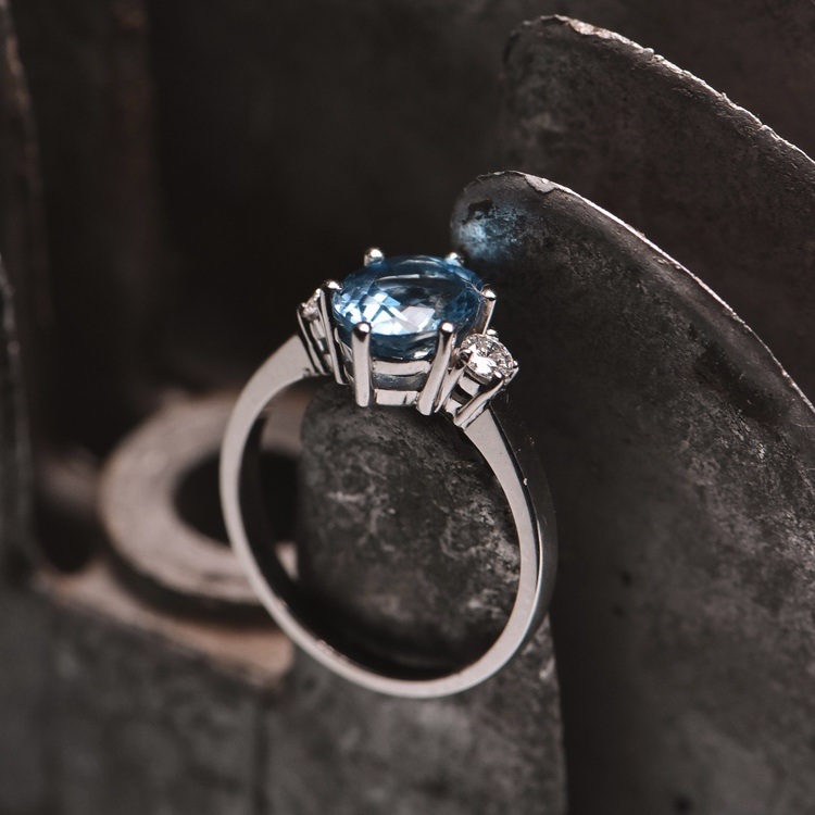 Delicate secondhand aquamarine ring in white gold with an oval faceted aquamarine in the center and two brilliant-cut diamonds on either side. The classic setting emphasizes the clarity of the stone.