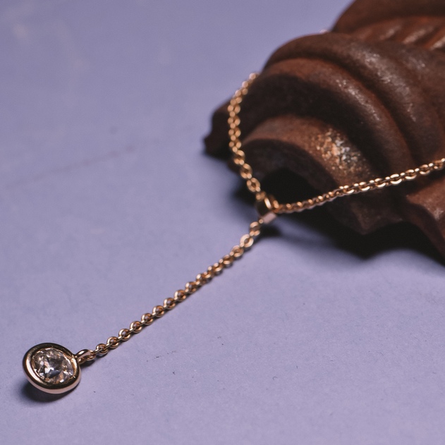 A finely crafted yellow gold Y-necklace with a movable old-cut diamond as its focal point. The clean lines give this secondhand piece of jewelry an elegant and contemporary look.